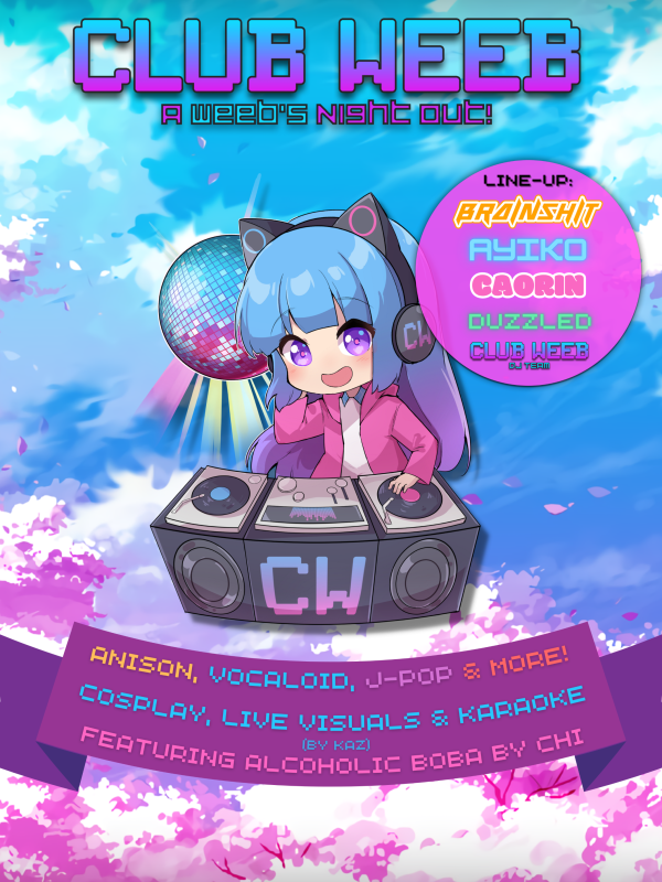 Welkom bij Club Weeb: de allereerste dansavond voor weebs, met exclusieve focus op Japanse popmuziek en animeseries. Japanse cultuur een gigantische niche? Nee hoor, getuige de ongekende populariteit van het genre in bioscopen, vinylrekken en op straat. Dompel je onder in een wonderlijke anime-wereld vol J-pop, visuals, fun-activiteiten en drankjes. Met exclusieve anime-sets van Deshima Sounds, DJ Lucy, en het Club Weeb DJ Team.