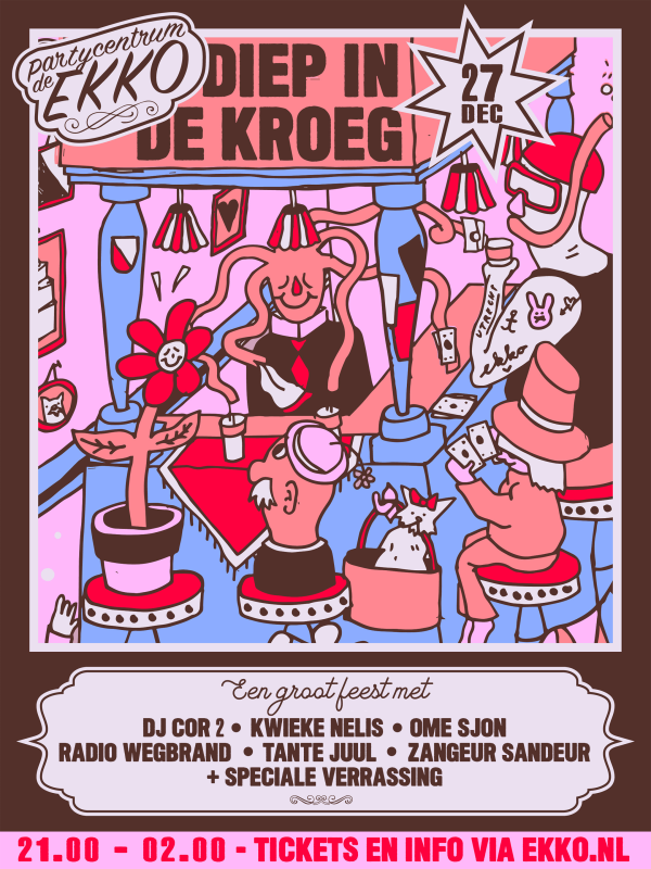 An evening full of entertainment, where DJ Cor 2, Radio Wegbrand, Uncle Sjon,Tante Juul, Zangeur Sandeur and Kwieke Nelis will make party center EKKO feel like the brown café you’ve always wished to be a regular at.